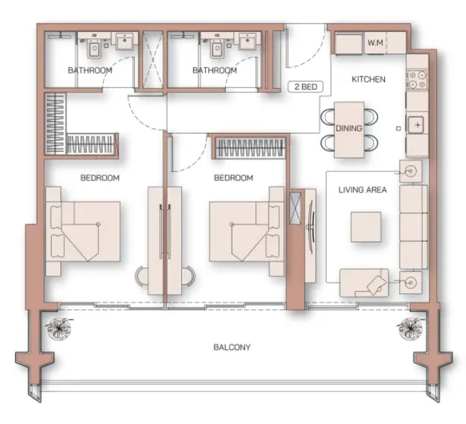 - Layout: 2 bedrooms, living and dining area, open kitchen, bathrooms;