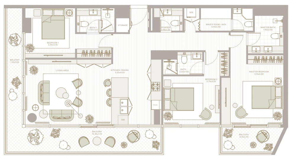 2-Bedroom Apartment 1,733 sq. ft. (161 m²) on the 1st Floor with Balcony in VIANI by Meteora, Liwan — Spacious Layout and Family-Friendly Format.