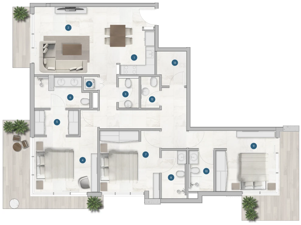 – Layout: bedroom, open-plan living room and kitchen, 2 bathrooms;