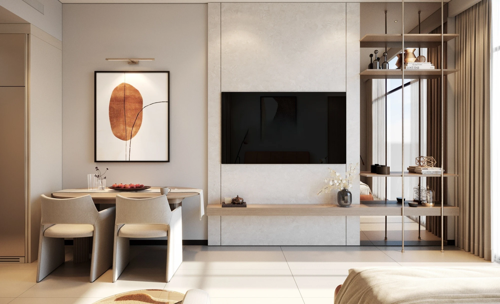 The interiors are designed in soft, neutral tones, with open layouts and premium finishes. A spacious living area connects to an open kitchen and a balcony overlooking the landscaped community. The master bedroom includes an en-suite bathroom, while the second bedroom can serve as a guest room or home office.